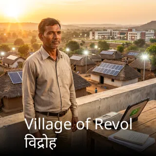 Create a cinematic Pocket FM style audiobook cover for a powerful rural revolution drama titled “Village of Revol – विद्रोह | एक आधुनिक क्रांति”. The cover should feel emotional, premium,....