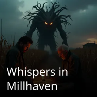 Whispers in Millhaven – A chilling Gothic horror audio series set in 1990s Millhaven. An old, crumbling farmhouse sits surrounded by overgrown cornfields and twisted, bare trees. Fog drifts through....